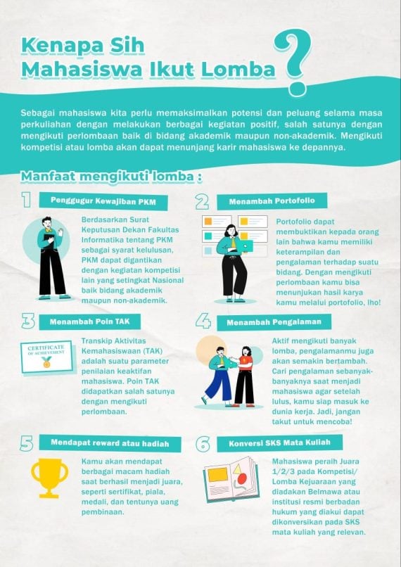 Sebagai mahasiswa, kita perlu meningkatkan potensi diri kita dengan mengikuti kegiatan positif seperti perlombaan baik di bidang akademik maupun non-akademik. Perlombaan dapat diikuti di dalam maupiun di luar kampus. Dengan mengikuti perlombaan, mahasiswa akan mendapatkan banyak manfaat yang dapat menunjang karir di masa depan. Beberapa manfaat mengikuti perlombaan bagi mahasiswa